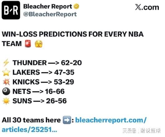 尽管这只是季前赛,但球迷仍然很兴奋。毕竟,休赛期太长了,每个人都等不及要看下一球队了。但是,东方和西部的局势似乎不同。东方是便宜的。可以说,只要您的表现不佳,就可以买到季后赛门票,而西方非常内向,一切似乎都无法挤压。 BR还预言了每个球队的常规记录,湖人和战士并列,他们都预计将获得47场胜利和35次失利。卫冕冠军雷霆队的前进,预计将赢得62场胜利,而布鲁克林篮网则在下面。毕竟,他们的阵容真的很顺利,没有被记录的压力。湖人和战士都有自己的问题。显然,47胜的记录是西方会议,他们可能没有获得季后赛门票。尽管如此,他们仍然可能在该地区的下半场,甚至参加季后赛。湖人队的阵容我S非常低。如果您在季前赛的第一场比赛中失去太阳,您会发现,只要核心消失了,湖人将无法打球。但是詹姆斯很老,你们都只指向唐西奇。在长82个常规天气游戏中,取得相对稳定的音符似乎很困难。勇士只是解决了续签口香糖合同的问题,并仅引入了新玩家。但是,季前赛即将开始,勇士队立即面临其他问题,前锋球员吉米·巴特勒(Jimmy Butler)再次受伤。这可能不是偶然的。不要忘记主要的战士球员,例如库里,巴特勒和朱门·格林,所有这些都在他们的职业生涯的尽头。如果其中一个缺少,那么勇士战斗的有效性将减少。如果您不小心,绝对可以直接进入彩票区域。在过去的两个赛季中,雷霆队一直领导联盟,所以不用担心雷霆队是否能捍卫自己的头衔。至少在常规时期,它们的下限非常稳定。尤其是这一天,雷霆管理人员偏离了普通人,并向许多将军提供脂肪合同。只要他们没有受到重大伤害或主动拆除球队的倡议,雷霆队至少在冠军比赛中至少五年。东部会议上的许多有权势的人被困,受伤或直接拆除了球队,因此尼克斯是最乐观的。他们预测,纪录是53场胜利和29次失利,他们是东部会议上最大的分析队。另一个纽约球队Nets处于无所作为的状态,与主要得分手Cameron Thomas一起,没人想要市场,篮网将迈克尔·波特(Michael Porter)的糟糕合同获得第一轮选秀权。西方的日子也处于类似的状态。杜兰特(Durant)和比尔(Bill)消失后,太阳队在季后赛中没有希望这样做,但他们只被预测赢得26。低估了布克。